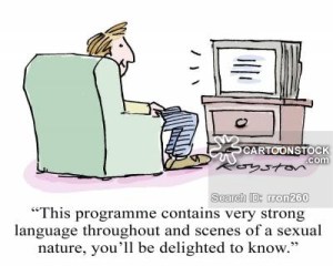 Man watching TV. Warning says: ‘This programme contains very strong language throughout and scenes of a sexual nature, you’ll be delighted to know.’